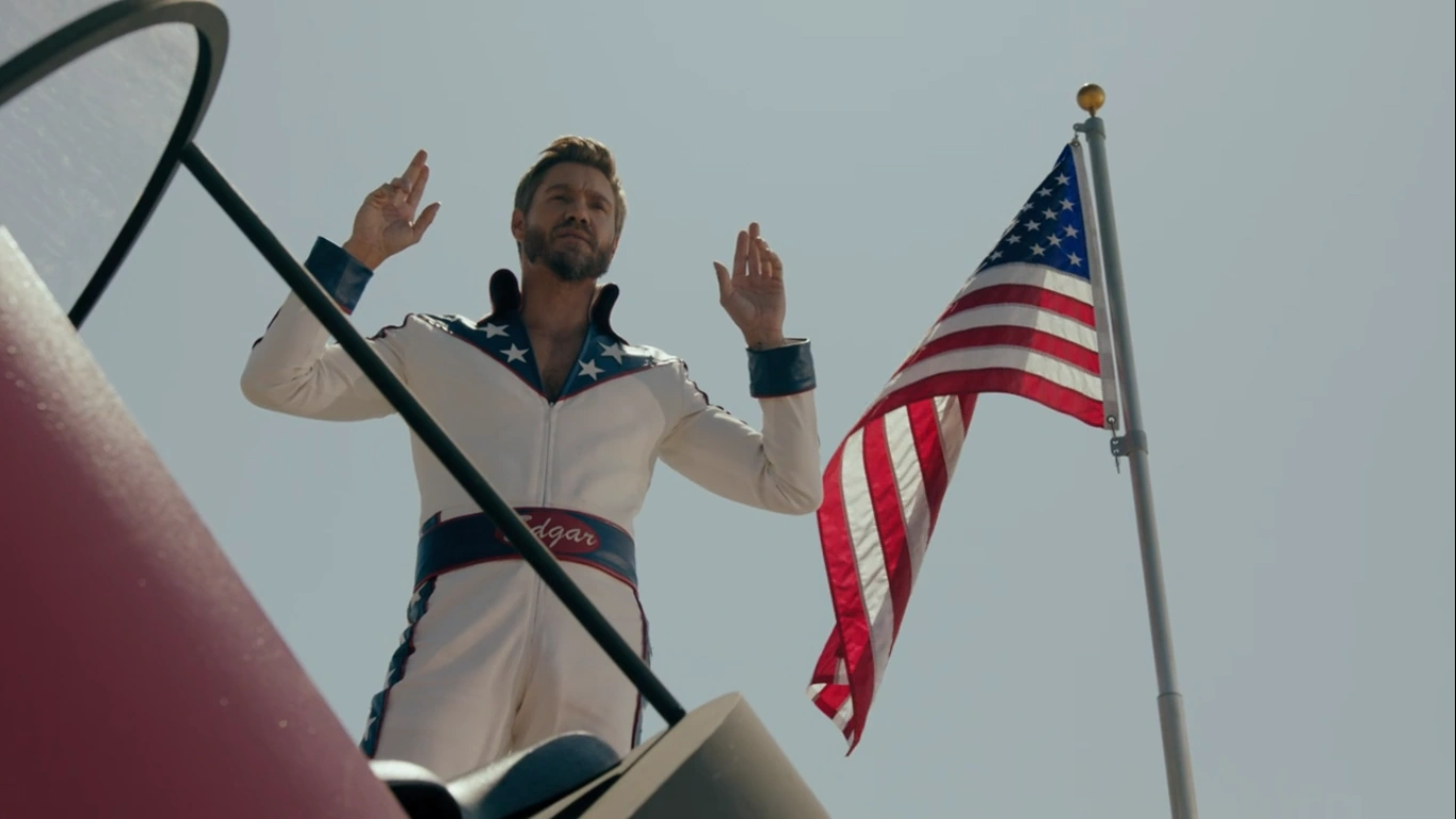 Edgar watched from the stairwell as Alice and Betty load the Farmies on the bus. Alice takes Evelyn's gun from Betty and hunts him down. Alice holds Edgar at gunpoint on the roof as he prepares to take off in his rocket. Edgar asks if Alice is familiar with the story of the prophet Elijah. He was seized by a whirlwind and lifted into the sky in a chariot of fire. Elijah ascended, and Edgar intends to as well. He reaches for the gun hidden in his back holster, but Alice shoots him before he can shoot her.[9]
