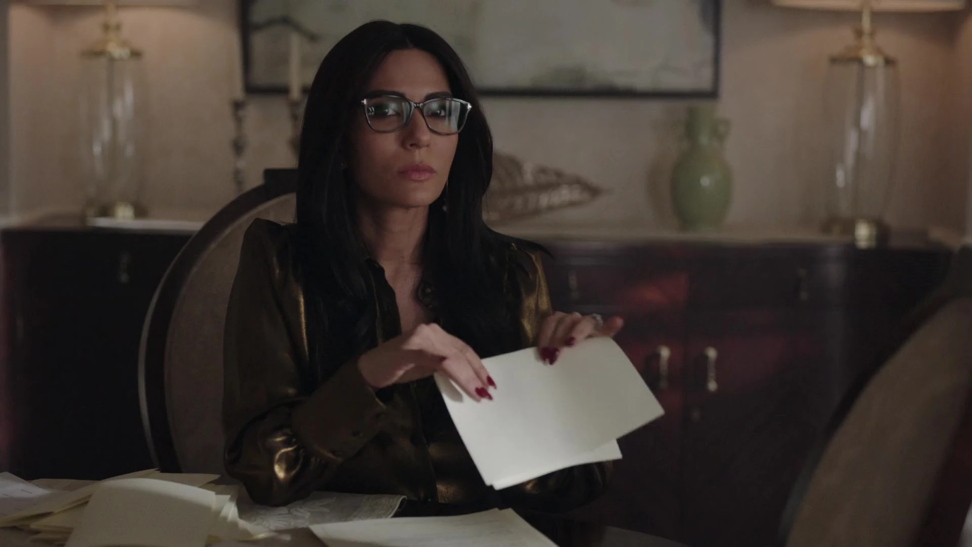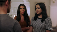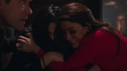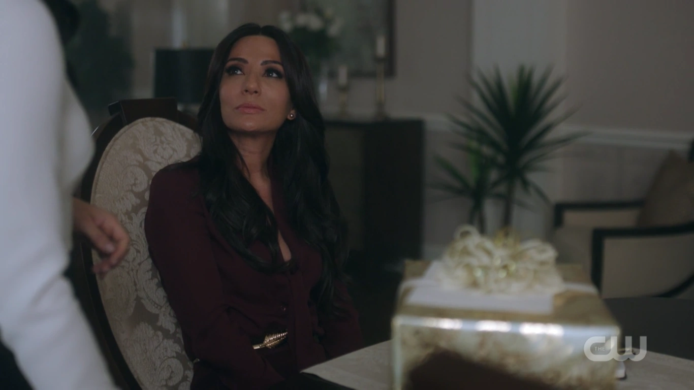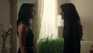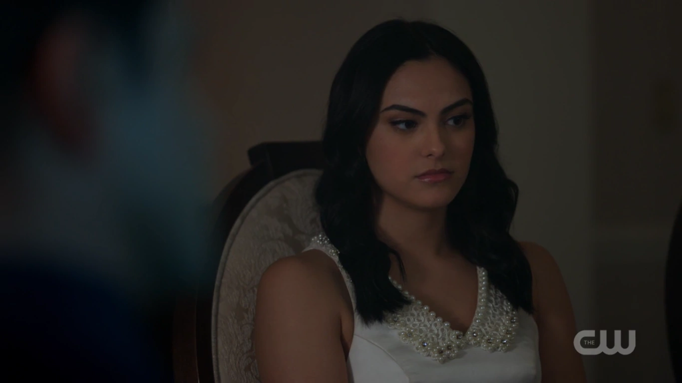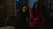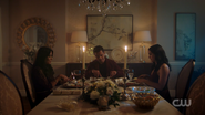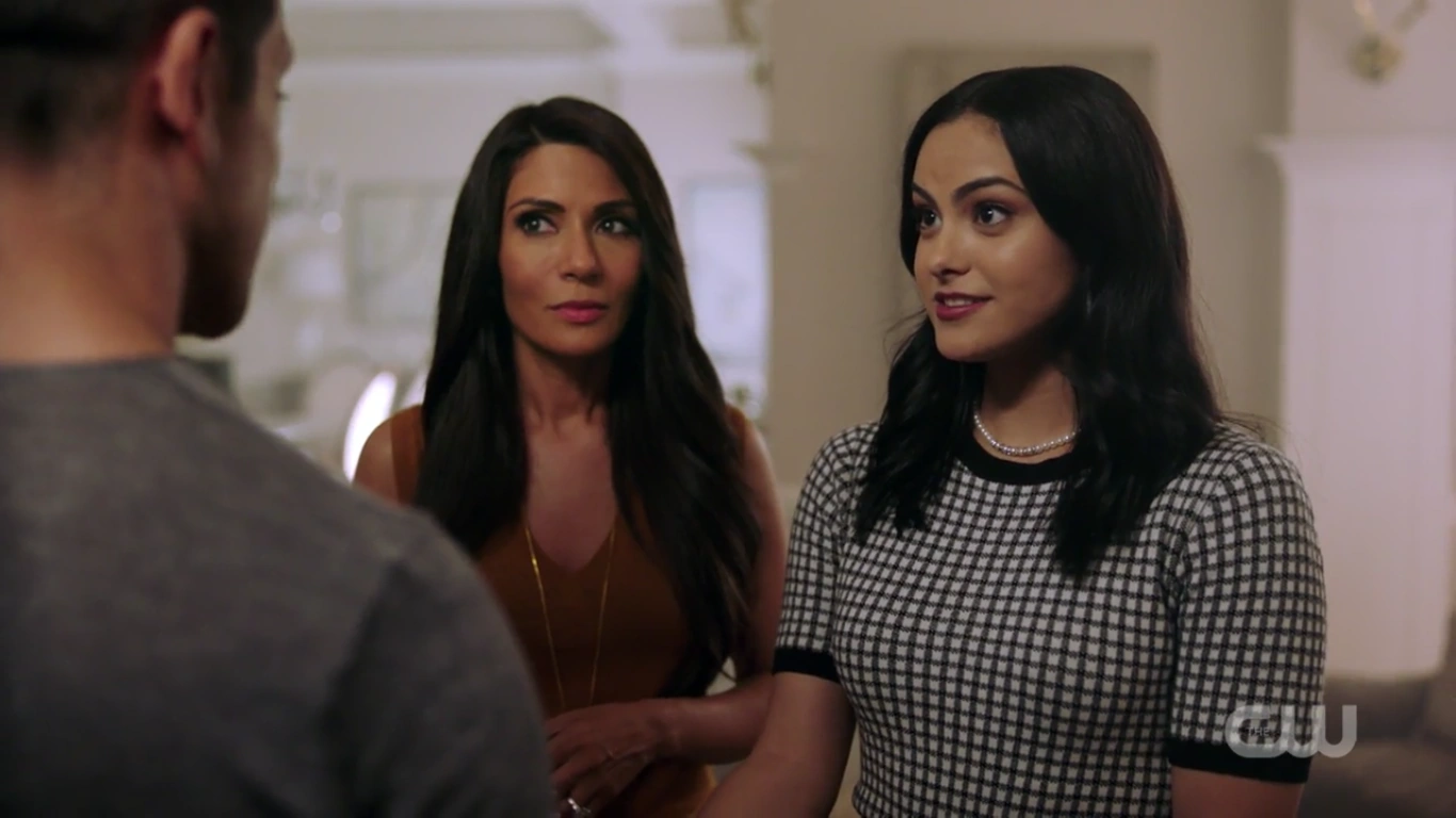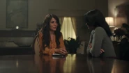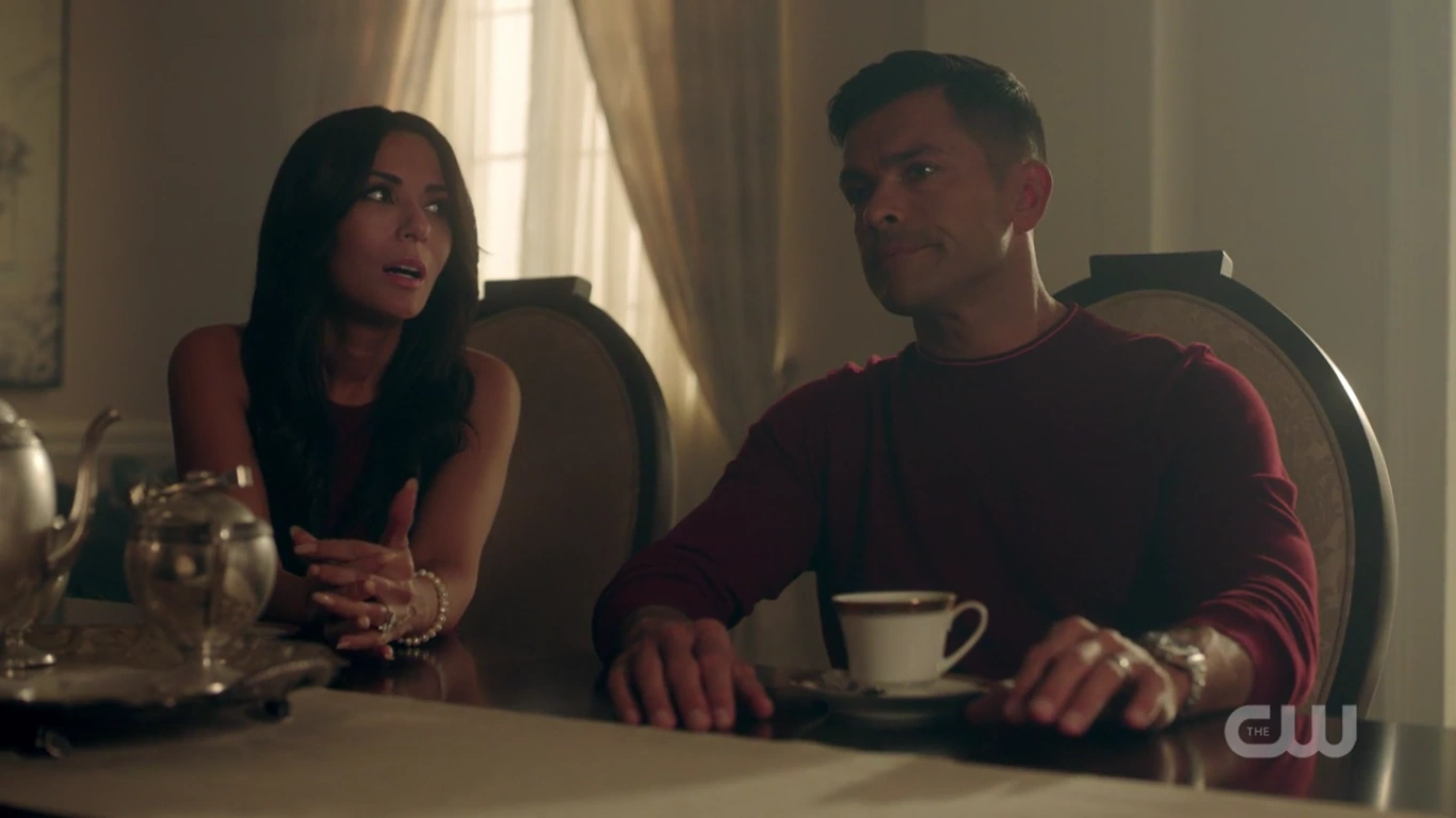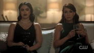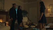 At the Pembrooke apartment, Veronica sat at the table with a glass of mimosa and a plate of chocolate almond croissant. When Hermione saw the glass of champagne in Veronica's hand, she reprimanded her for opening the bottle of Cristal that was saved for her father's return. Veronica got a phone call from Betty, who spread the news from Archie about Fred's critical condition following the incident at Pop's Chock'lit Shoppe. Hermione threatening Veronica to get back in line with the family With Fred's life hanging in the balance, Hermione headed to the Chapel to pray in his name. However, she was interrupted by Veronica, who questioned if she was praying for Fred's speedy recovery or a quick death. Veronica explained Jughead's theory about the shooting, and how it may have been a hit, which left Veronica wondering who would be evil enough to commit such a heinous act. Veronica then remembered how Hermione wanted Fred to sell his share of the company back because he and Hiram wouldn't get along. Hermione initially assumed that the target of Veronica's accusations was Hiram, but in actuality, Veronica directed them towards her. Veronica no longer saw her as an innocent pawn. She believed Hermione to be Hiram's eyes and ears on the ground, calling the shots while he's in prison. Hermione rose to her feet as she informed Veronica that her disrespect would no longer be tolerated. She offered her daughter a word of advice; to get back in line with the family because she's a Lodge above all else. She should slap Veronica for what she's insinuating, but Hermione claimed that she's not a violent person. Veronica returned home after a long day at the hospital to be greeted by the appearance of Hiram who was sitting in the dining room with her mother standing beside him. He told her that he came early to surprise her, imagining she'd be home, waiting to greet him upon his return. However, he was the one who was surprised when he later found out she wasn't at home. Hermione chimed in, telling Hiram about how she also drank his Cristal. Hiram reprimanded her for her disrespectful act and remarked how this was not like Veronica at all, to which she admitted to changing since the last time they saw one another...but the question is, had he? He may have changed, but not so much as he didn't want a kiss hello from his daughter. Veronica then walked over to give her father a kiss on his cheek. She then informed them, of Fred's recovery from the gunshot wound, as he had finally woken up.[12] Seccretly Buying Pop's Veronica handing her mother the letter from her father Upon returning home that evening, Veronica got a call from Betty, telling her that the diner was being bought by an anonymous buyer, which was the same description given for Hiram when he was secretly buying the Twilight Drive-In. Veronica entered the dining room, and accused her father of buying the diner in an attempt to buy her. Hiram claimed that he wasn't buying Pop's, and then requested that Veronica sit so that they can talk civilly. Since her father wanted to talk so badly, Veronica suggested that they talk about Mr. Andrews, since he was shot one day after he rejected the offer to sell his portion of the SoDale project, which had Veronica wondering if it's her father's doing. Hiram denied shooting Fred. Nor did he hire anyone to shoot him. Unconvinced with her father's claims of innocence, Veronica explained that she was his fiercest protector. Whenever someone called him the devil incarnate, she always came to his defense, telling herself that he wasn't that bad and that he can be forgiven. However, this changed when she received the letter from him, threatening her mother. Veronica then handed Hermione the letter, telling her to think about the kind of man that they're letting back into their lives. After reading the letter, Hermione told Veronica that she wrote the letter threatening herself in order to get Veronica to testify on Hiram's behalf, so that they could be reunited as a family once more. The following night, Hermione and Hiram attended Retro Night at Pop's in support of Veronica and her cause to keep the shoppe from closing. With the night being a new beginning for Pop's, Veronica suggested that maybe the night can be a new beginning for them as well. However, she asked for total transparency in return. In the spirit of that, Hiram proposed that Lodge Industries make a "charitable contribution" to the diner.[13] Veronica asking if her friends can come over Seeing her mother near her father's study with his morning coffee, Veronica offered to take it to him as she had something that she would like to discuss with him. But as Veronica was reminded by her mother, she wasn't allowed in her father's study. Those were the old rules, Veronica retorted. Which still applied, Hermione explained. Hearing their voices just outside the door, Hiram joined them in the main room, where Veronica asked if she could have her inner circle of friends over to watch the season premiere of the Matchlerette. She even invited her father to join them as her friends were supposedly dying to meet him. On their way to dinner at the club later that night, Hermione and Hiram passed through the living room to greet Veronica's friends. However, they couldn't help but overhear the discussion the teens were having, where they showed great frustration with Sheriff Keller and his inability to catch the killer. Being a man that has had his fair share of run-ins with the law, Hiram offered them a word of advice; he could say with confidence that the police aren't always the solution. Sometimes they needed to stand up and protect themselves. On that note, Hermione decided to cut Hiram's speech short, telling him that if they didn't leave in that moment, that they would lose their seats. Then, before heading out the door, Hiram unexpectedly invited Archie over for dinner later in the week as he looked forward to seeing what he came up with to saving Riverdale. Th